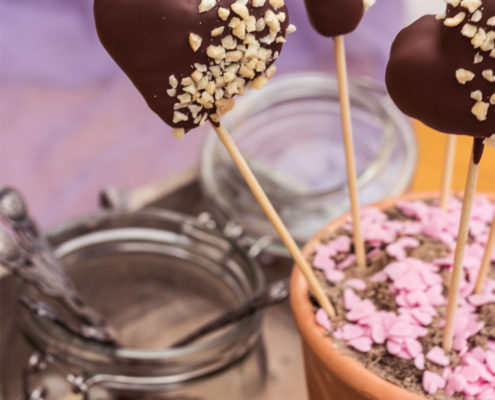 - Melt the remaining chocolate in a bain-marie and then allow it to cool down for some minutes until about 40 degrees. Dip the chilled cake pops into the chocolate, let the chocolate drip off well and then, in each case, sprinkle one half of the cake pops with almonds.