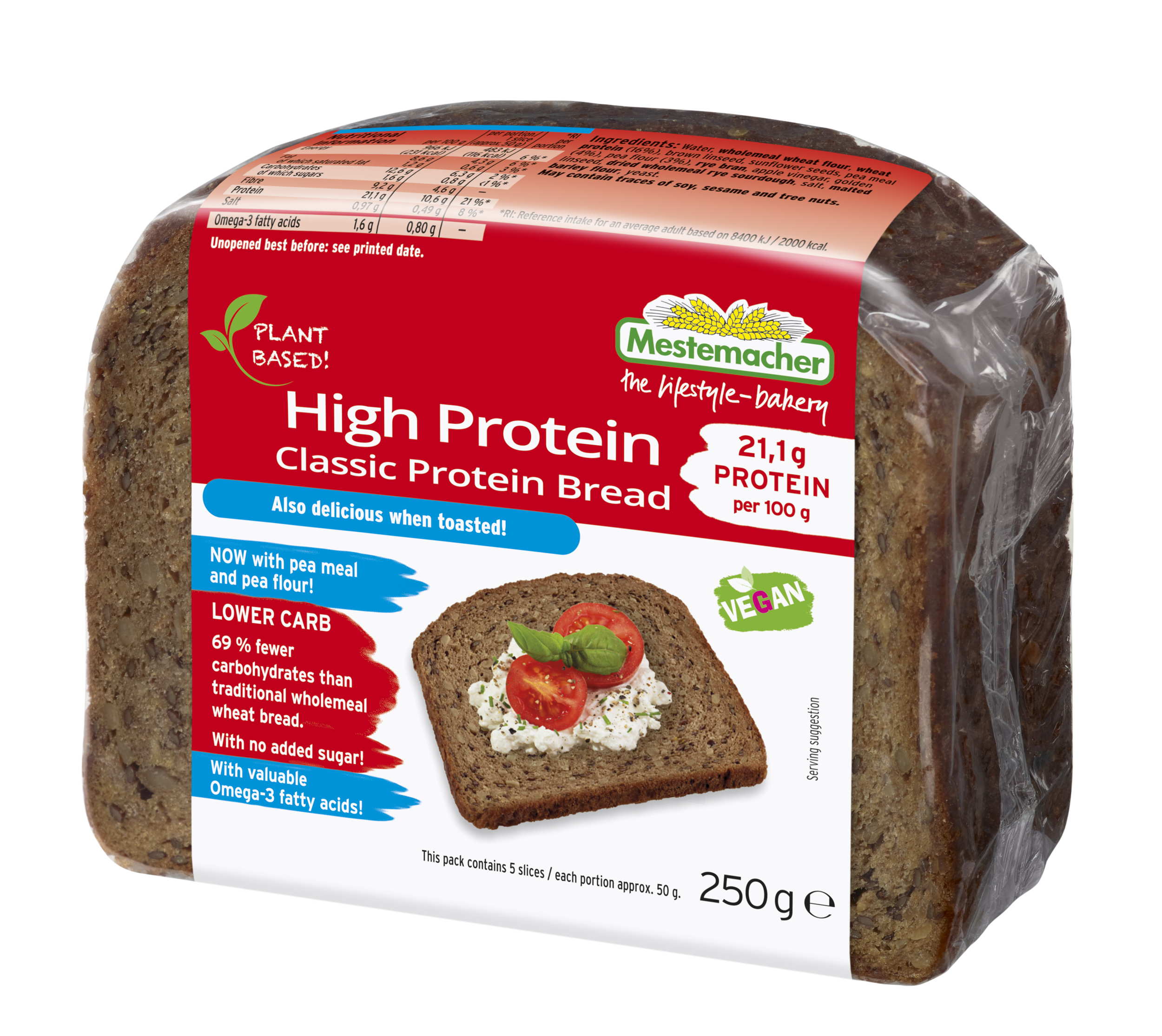 Water, wholemeal wheat flour, wheat protein (16 %), brown linseed, sunflower seeds, pea meal (4 %), pea flour (3 %), rye bran, apple vinegar, golden linseed, dried wholemeal rye sourdough, salt, malted barley flour, yeast.